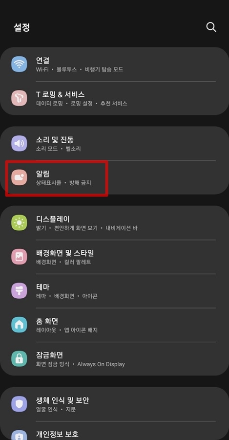 1. 먼저 갤럭시 설정 화면으로 들어갑니다. 중간 쯤 보이는 알림 설정에 들어간 후 하단의 '고급설정' 탭을 클릭해줍니다.