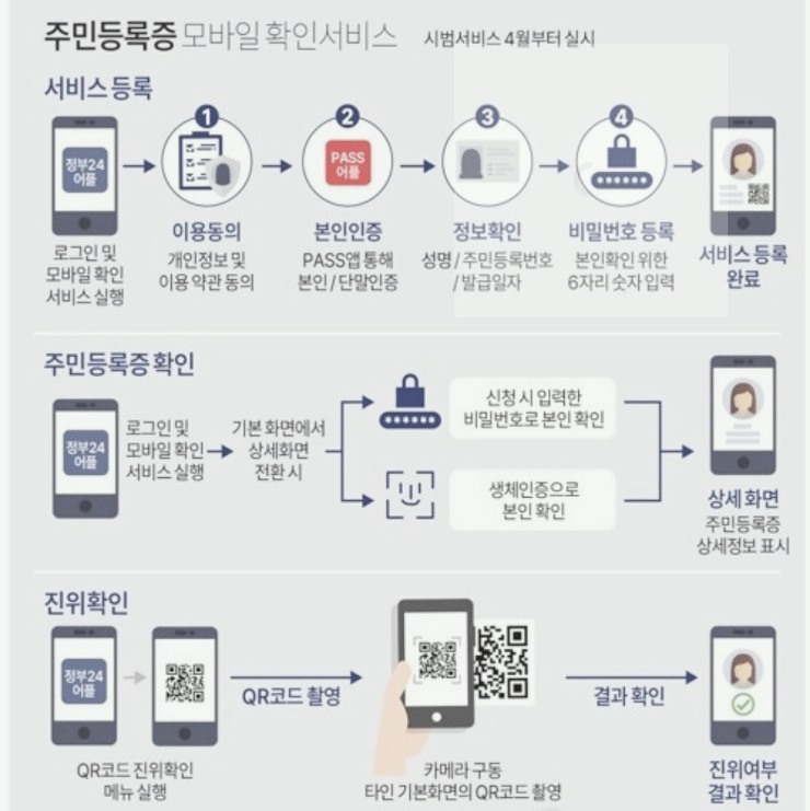 이처럼 신분증은 나의 신분을 증명하는 중요한 수단이다 보니 잃어버리게 되면 난감한 상황이 발생할 수 있습니다. 사진으로 찍은 신분증이 있다고 하더라도 실물 신분증이 아니면 인정해주지 않는 경우가 대부분이라 증빙이 되지 않아 불편한 상황도 발생하죠. 그런데 4월부터 '모바일 주민등록증' 서비스가 도입되어 실물 주민등록증 카드 없이도 신분 확인이 가능해졌다고 합니다.
